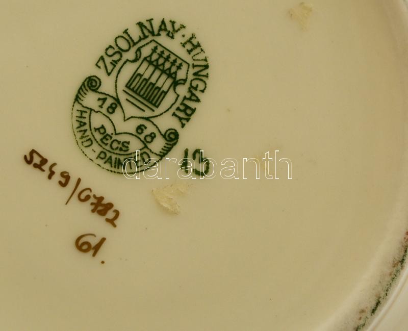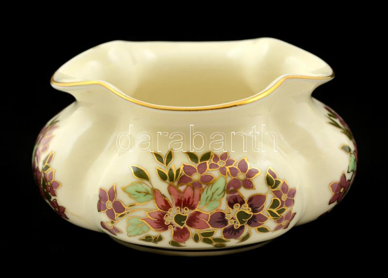 Leírás: Zsolnay kis kaspó, kézzel festett, jelzett, hibátlan, m:6 cm, d:22 cm