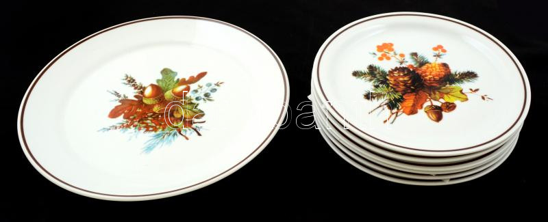 Leírás: Zsolnay retro karácsonyi süteményes készlet, 6+1 tányér, matricás, jelzett, hibátlan, d:19,5 cm (6×), d:25 cm