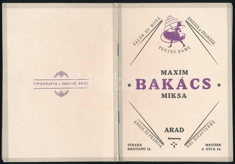 1924 aradi Bakács Miksa divatüzletének képes reklámfüzete. https://www.darabanth.com/hu/288-Gyorsarveres/288.0/Festmeny-mutargy-papirregiseg-egyeb/Reklam~20/1924-aradi-Bakacs-Miksa-divatuzletenek-kepes-reklamfuzete~II1516012