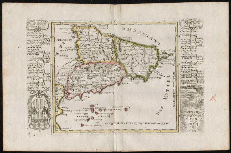 cca 1700 A Szicíliai Királyság térképe. Színezett, díszes kartusú rézmetszet. Megjelent: Johann Hofmann Atlas Curieux oder neuer und Compendieuser Atlas. (Augsburg, 1700). Méret: 29x20 cm / cca 1700 Map of Kingdom of Sicily, Italy. Colored etching 31x20 cm