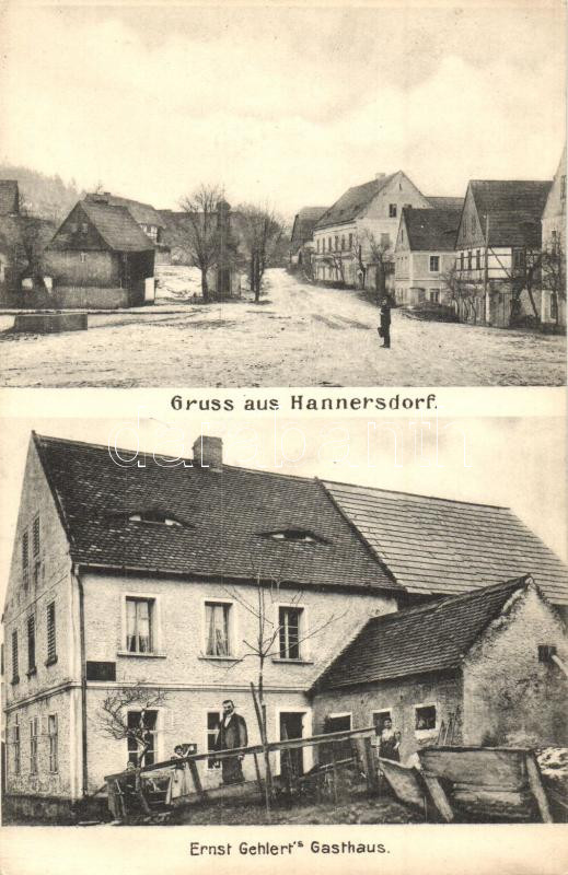 Leírás: Sámfalva, Hannersdorf; utcakép, Ernst Gehlert vendéglője / Gasthaus / street, guest house (EK)