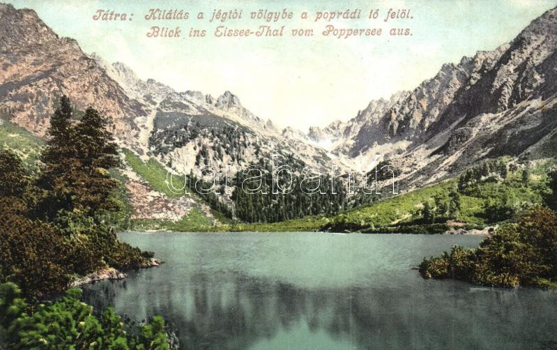Leírás: Tátra, Poprádi tó, Jégtó völgye, Cattarino S. utóda Földes Samu kiadása / lake, mountains, valley (EK)