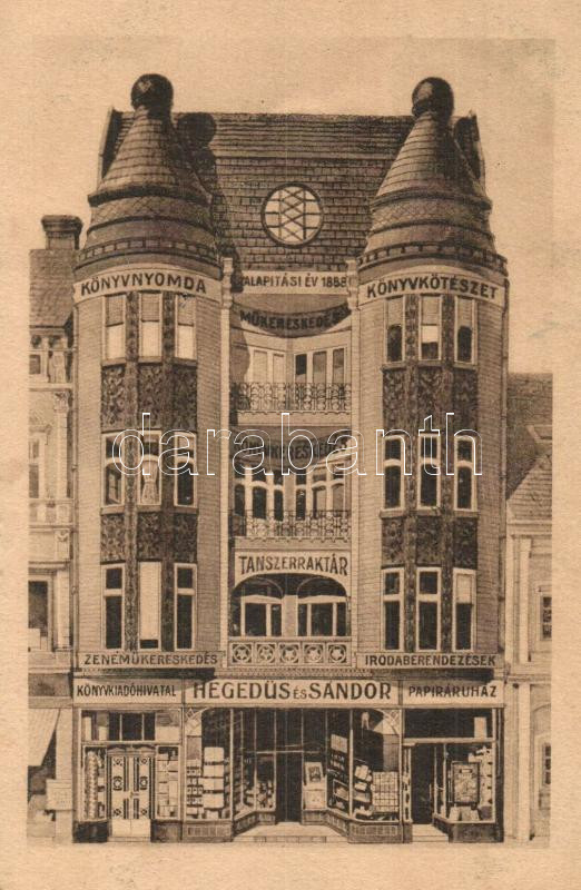 Leírás: Debrecen, Hegedűs és Sándor könyvkiadó hivatala és papíráruháza és saját kiadású képeslapjuk