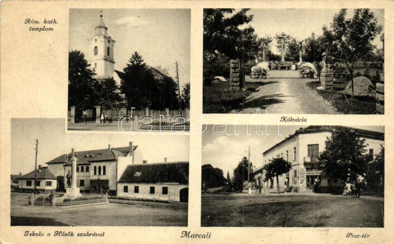 Leírás: Marcali, Iskola, Hősök szobra, Piac tér, Kálvária (EK)
