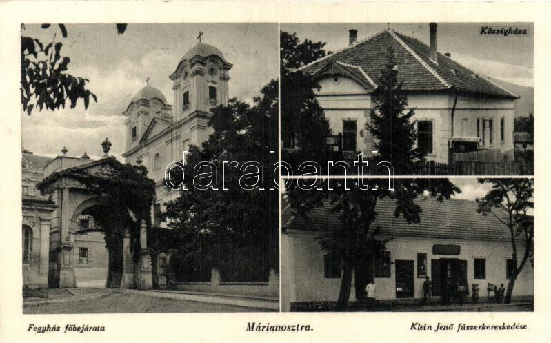 Leírás: Márianosztra, Fegyház főbejárat, községháza, Klein Jenő fűszerkereskedése, kiadja Klein Jenő