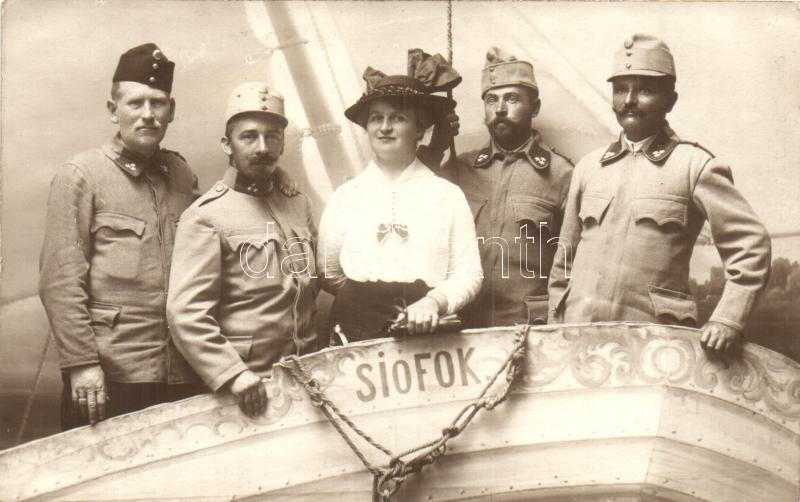 Leírás: Siófok, műtermi fotó katonákkal és hölggyel. Ellinger Ede fényképész photo