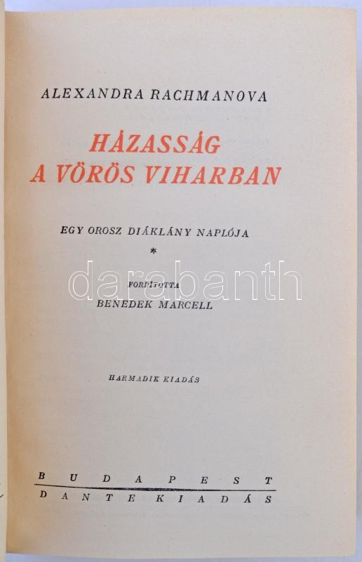 Alexandra Rachmanova: Házasság a vörös viharban. Egy orosz diáklány naplója. Fordította Benedek Marcell. Halhatatlan könyvek. Bp.,é.n., Dante. Kiadói aranyozott egészvászon-kötés.