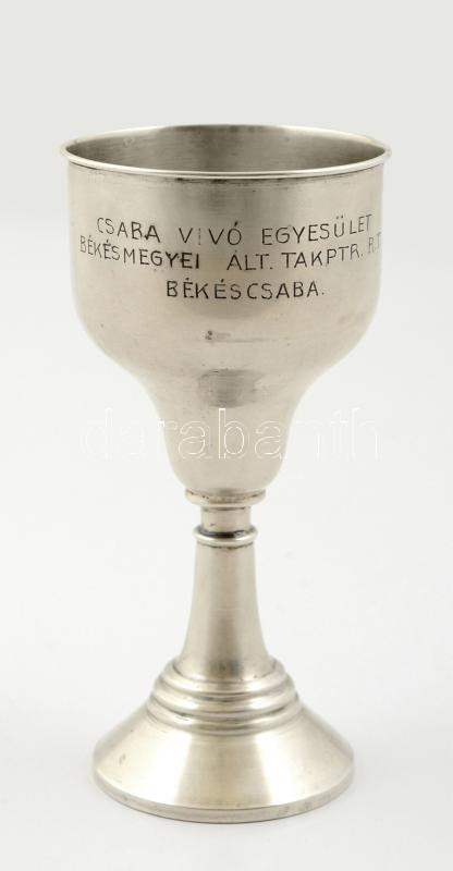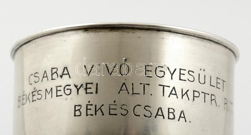 Leírás: Ezüst (Ag.) kupa, "Csaba Vívó Egyesület / Békésmegyei Általános Takarékpénztár Rt. / Békéscsaba" felirattal, jelzett, d: 7 cm, bruttó 91,3 g