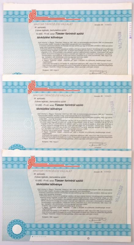 Budapest 1992. "Magyar Távközlési Vállalat" távközlési kötvé... https://www.darabanth.com/hu/288-Gyorsarveres/288.0/Numizmatika/Reszvenyek-es-sorsjegyek~300005/Budapest-1992-Magyar-Tavkozlesi-Vallalat-tavkozlesi-kotvenye-10Ft-rol-6x-5db-sorszam~II1511595