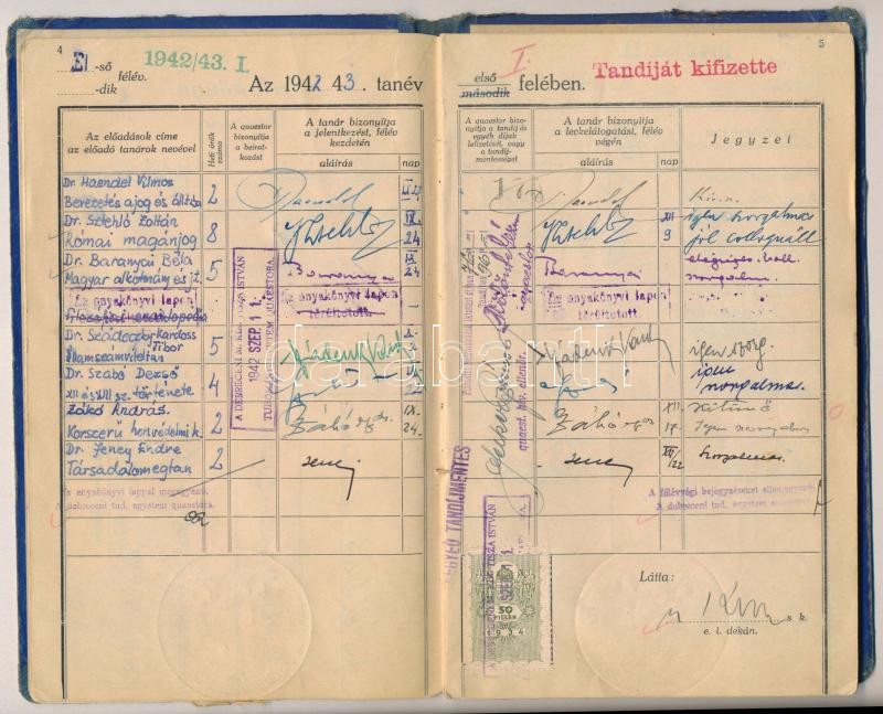 1942 Debrecen, A debreceni M. Kir. Tisza István Tudományegyetem által kiadott index, benne neves tanárok aláírásaival(Zákó András, Szádeczky-Kardoss Tibor, stb.)