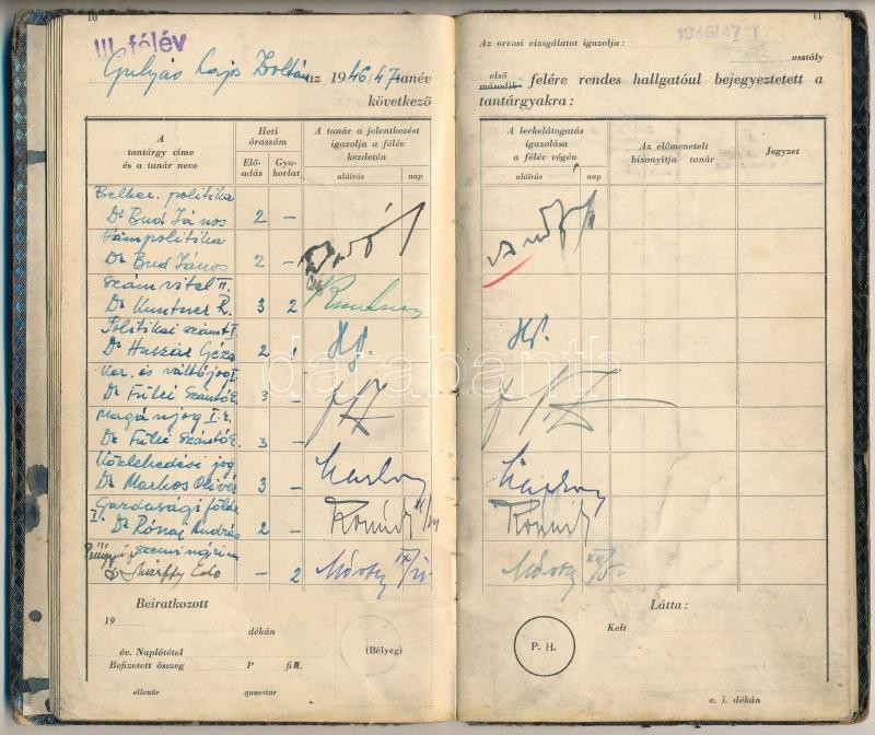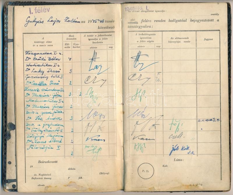1945 Bp., M. Kir. József Nádor Műszaki és Gazdaságtudományi Egyetem által kiadott leckekönyv, benne neves tanárok aláírásával(Bud János, Czettler Jenő, stb.)