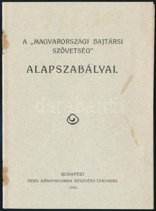 1916 A "Magyarországi Bajtársi Szövetség" alapszabályai, szétjött tűzé... https://www.darabanth.com/hu/289-Gyorsarveres/289.0/Festmeny-mutargy-papirregiseg-egyeb/Militaria~26/1916-A-Magyarorszagi-Bajtarsi-Szovetseg-alapszabalyai-szetjott-tuzessel-egyebkent-jo~II1520381