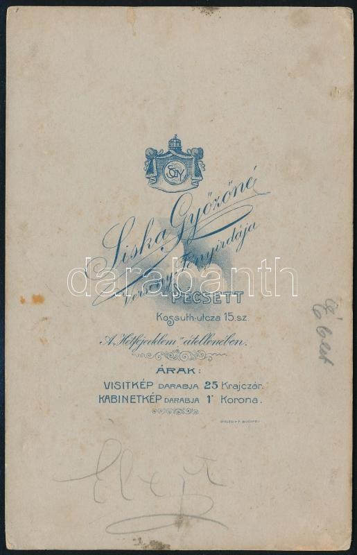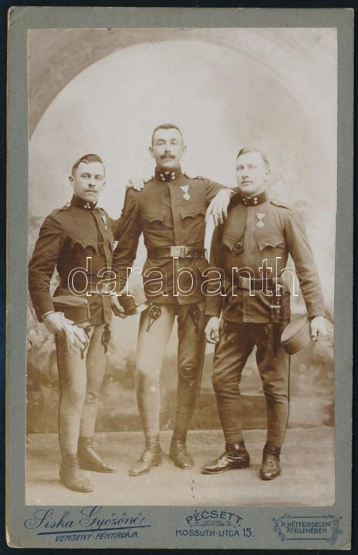 cca 1900 Osztrák-magyar katonák műtermi fotója, köztük huszár százados és főhadnagy, kitüntetésekkel, Liska Győzőné Verseny Fényirdája Pécs, keményhátú fotó, 14,5x9,5 cm