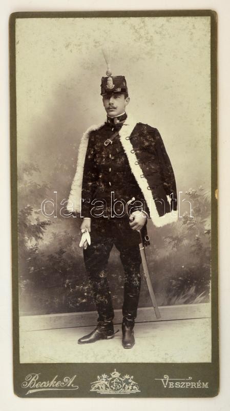 Leírás: cca 1910 Fodor Jenő huszárhadnagy fotója, Becske A., Veszprém, keményhátú fotó, 20x10 cm.,