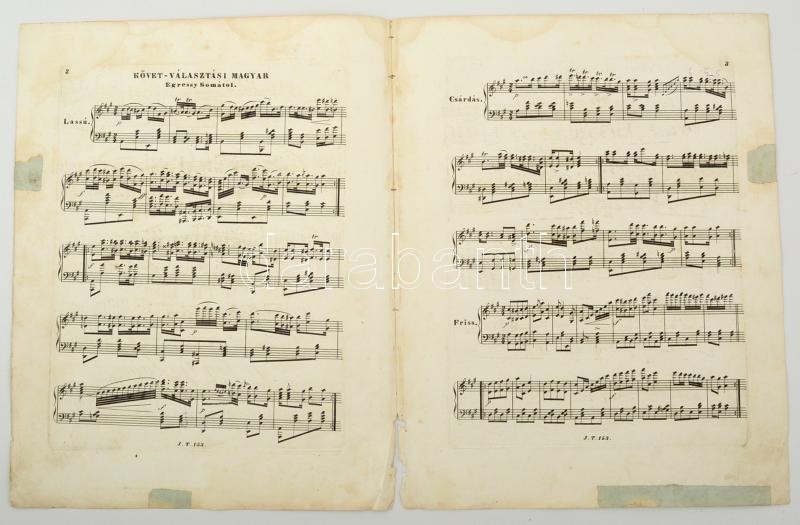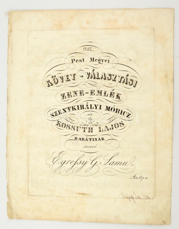 Leírás: 1847 Pest Megyei Követválasztási zeneemlék, Szentkirályi Móric Kossuth Lajos barátainak szerzé Egressy Samu - kotta