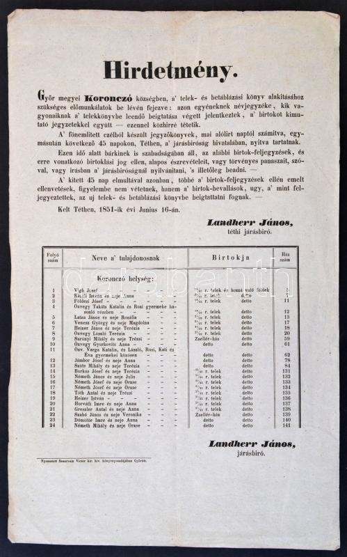 Leírás: 1851 Tét, Hirdetmény Koroncó község új föld- és telektulajdonosairól
