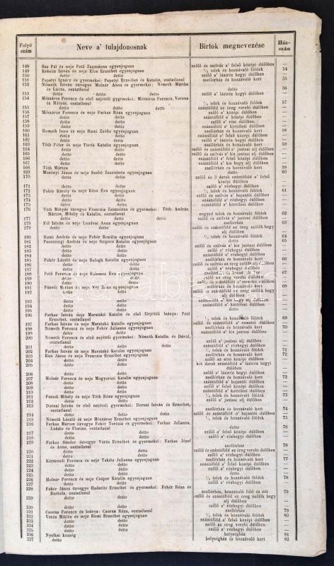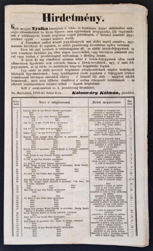 Leírás: 1852 Hirdetmény Nyalka község föld- és telektulajdonosairól