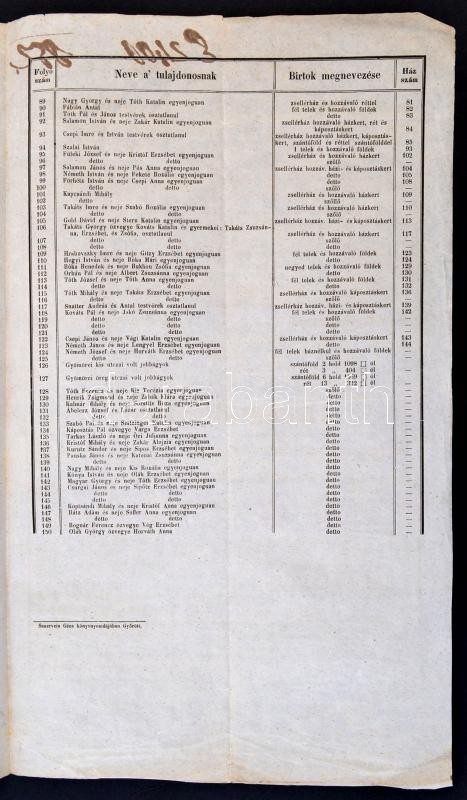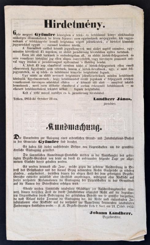 Leírás: 1852 Tét, Hirdetmény Gyömöre község föld- és telektulajdonosairól