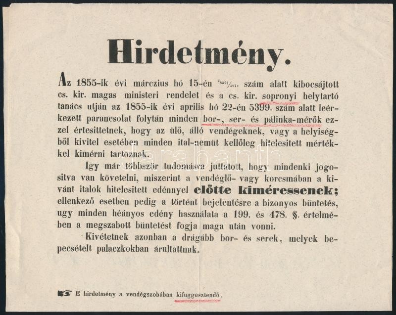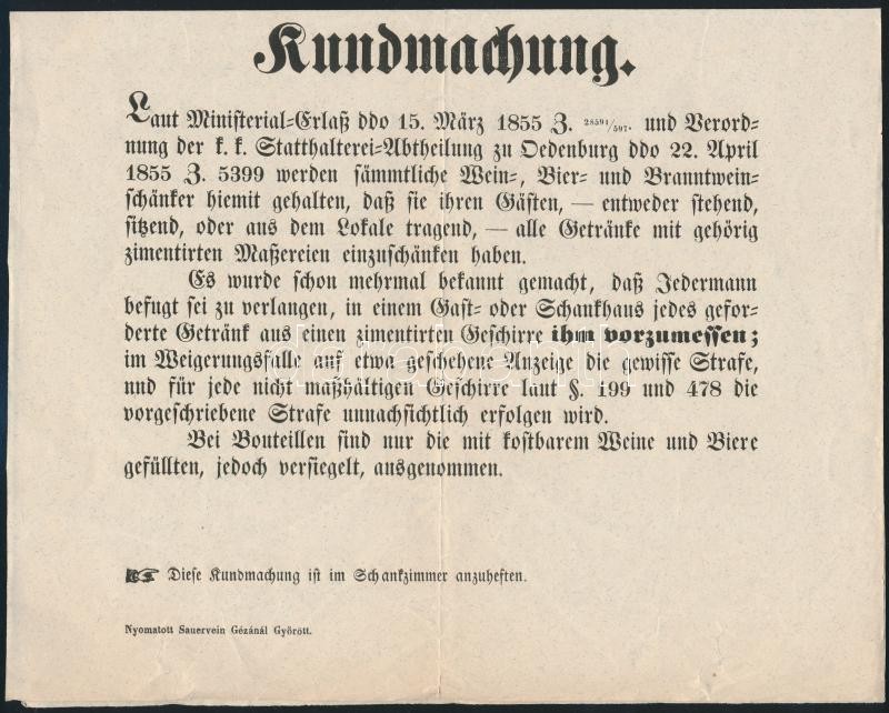 Leírás: 1855 Hirdetmény kocsmák részére a hitelesített mérőedénnyel való mérés kötelezettségéről