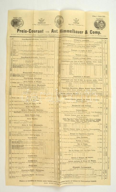 Leírás: 1873 Bécs, Himmelbauer Antal és Társa szappankereskedés árjegyzéke, német nyelven, 47x30 cm / Ant. Himmelbauer & Comp. soap factory catalogue
