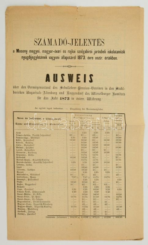 Leírás: 1873 Számadó jelentés a Moson megyei iskolai tanítók nyugdíjegyletének vagyoni állapotáról