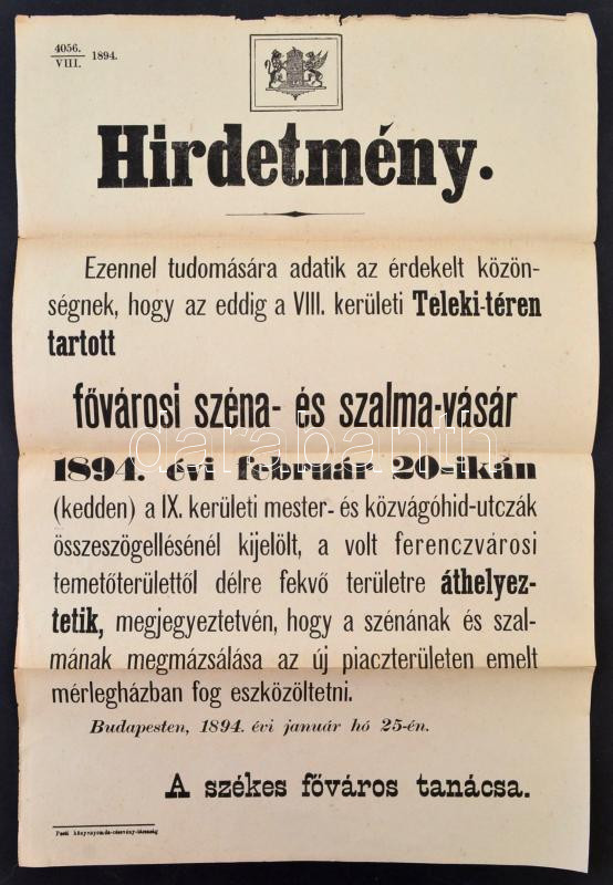Leírás: 1894 Fővárosi szénavásár hirdetmény