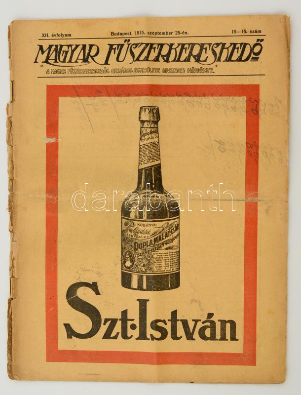 1915 A Magyar Fűszerkereskedő XII. évfolyamának 15-16. száma, hajtott,... https://www.darabanth.com/hu/289-Gyorsarveres/289.0/Festmeny-mutargy-papirregiseg-egyeb/Nyomtatvanyok~28/1915-A-Magyar-Fuszerkereskedo-XII-evfolyamanak-15-16-szama-hajtott-szakadassal~II1521284