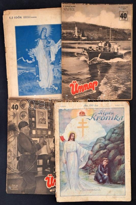 1923-1941 Különféle régi folyóiratok, összesen 14 db (A kezdet és a vég (1 db), Az idők jelei (6 db), Képes Ujság (1 db), Uj Idők (1 db), Ünnep (4 db), Képes Krónika (1 db)), változó, többnyire kissé viseltes, szakadozott állapotban.
