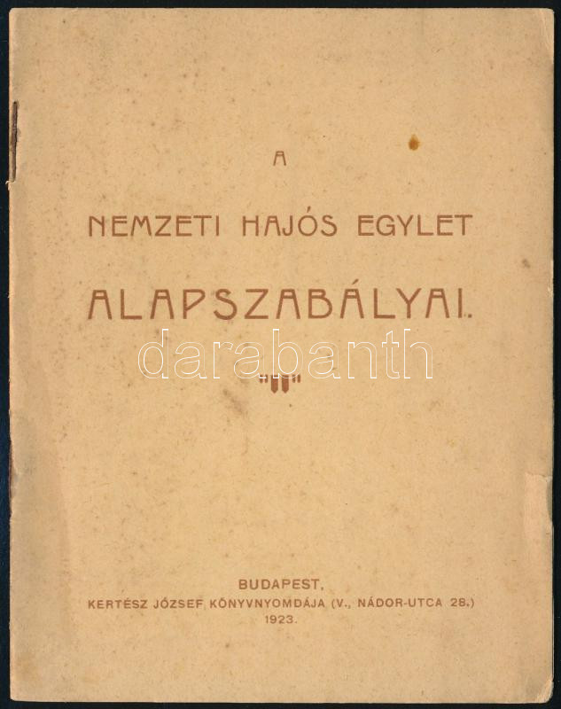 1923 Bp., A Nemzeti Hajós Egylet alapszabályai, 14p https://www.darabanth.com/hu/289-Gyorsarveres/289.0/Festmeny-mutargy-papirregiseg-egyeb/Nyomtatvanyok~28/1923-Bp-A-Nemzeti-Hajos-Egylet-alapszabalyai-14p~II1520705
