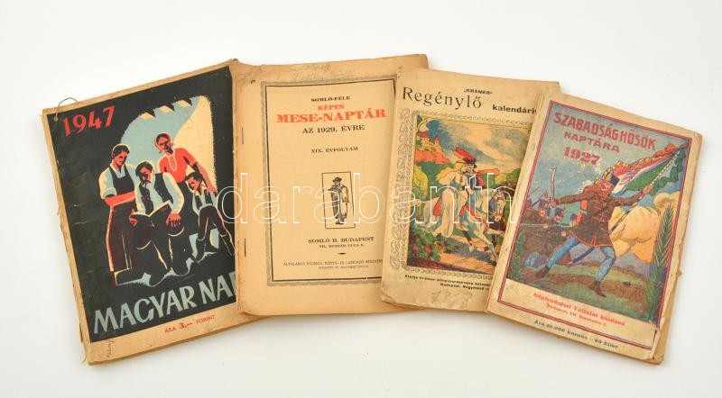 Leírás: 1927-1947 4 db különböző naptár(Szabadsághősök Naptára, Krámer Regénylő Kalendáriuma, Képes Mese-Naptár, magyar Naptár)