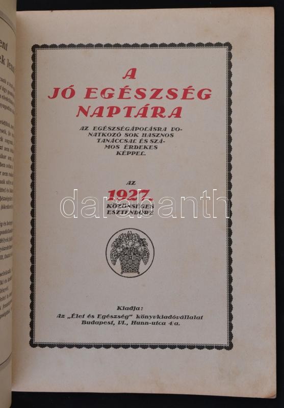 1927Jó egészség naptára. Bp., 'Élet és Egészség', kissé foltos borítóv... https://www.darabanth.com/hu/289-Gyorsarveres/289.0/Festmeny-mutargy-papirregiseg-egyeb/Nyomtatvanyok~28/1927Jo-egeszseg-naptara-Bp-Elet-es-Egeszseg-kisse-foltos-boritoval-kisse-szakadt-~II1522304