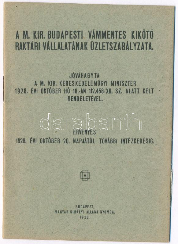 1928 A M. Kir. Budapesti Vámmentes Kikötő Raktári vállalatának üzletszabályzata. Jóváhagyta a M. Kir. Kereskedelmi Miniszter 1928. évi október hó 18-án 112,458/XII. sz. alatt kelt rendeletével. Bp., Magyar Királyi Állami Nyomda.