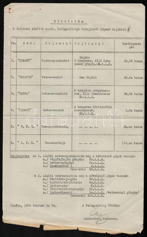 1934 Kimutatás a Balatoni Kikötők m. kir. Felügyelősége tulajdonát kép... https://www.darabanth.com/hu/289-Gyorsarveres/289.0/Festmeny-mutargy-papirregiseg-egyeb/Nyomtatvanyok~28/1934-Kimutatas-a-Balatoni-Kikotok-m-kir-Felugyelosege-tulajdonat-kepezo-hajokrol-Egy-b~II1521760