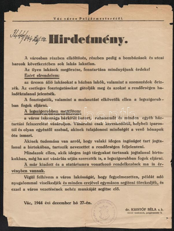 Leírás: 1944 Vác városi hirdetmény a bombázások miatt lakatlan lakások megőrzésére 25x33 cm