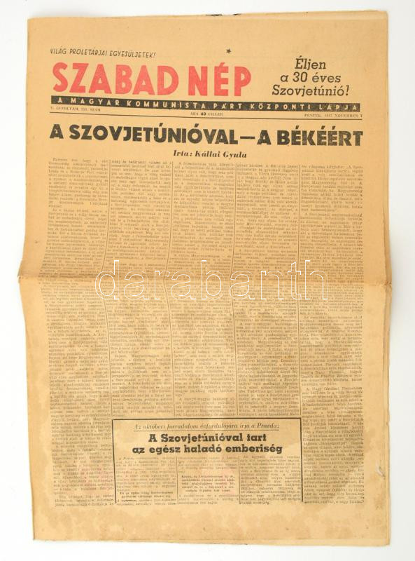 Leírás: 1947 Szabad Nép V. évfolyam 253. szám, 1947. November 7., kissé foltos állapotban.