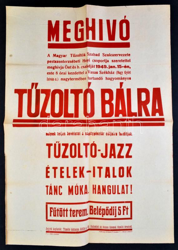 1949 Meghívó Tűzoltóbálra. Plakát. 40x60 cm https://www.darabanth.com/hu/289-Gyorsarveres/289.0/Festmeny-mutargy-papirregiseg-egyeb/Nyomtatvanyok~28/1949-Meghivo-Tuzoltobalra-Plakat-40x60-cm~II1521246