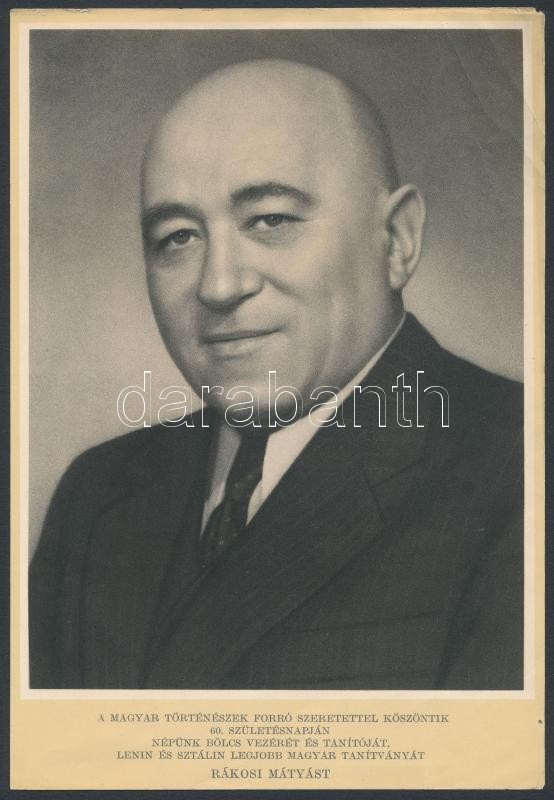 Leírás: 1952 Rákosi Mátyás sokszorosított fotója a magyar történészek köszöntőjével 60. születésnapja alkalmából. Ofszet kép 24x16 cm
