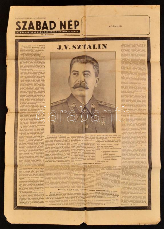 1953 A Szabad Nép különkiadása Sztálin halálhírével plakát méret 40x60... https://www.darabanth.com/hu/289-Gyorsarveres/289.0/Festmeny-mutargy-papirregiseg-egyeb/Nyomtatvanyok~28/1953-A-Szabad-Nep-kulonkiadasa-Sztalin-halalhirevel-plakat-meret-40x60-cm~II1519937
