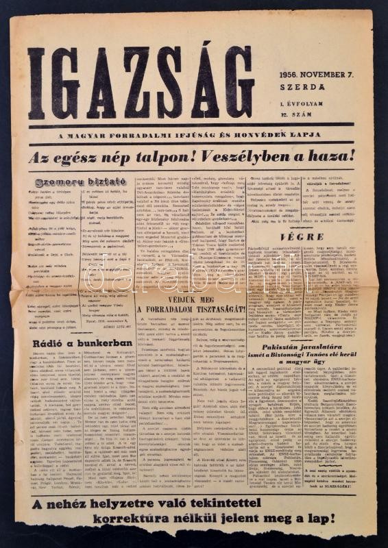 Leírás: 1956. november 7. Az Igazság I. évfolyamának 12. száma, benne a forradalom híreivel