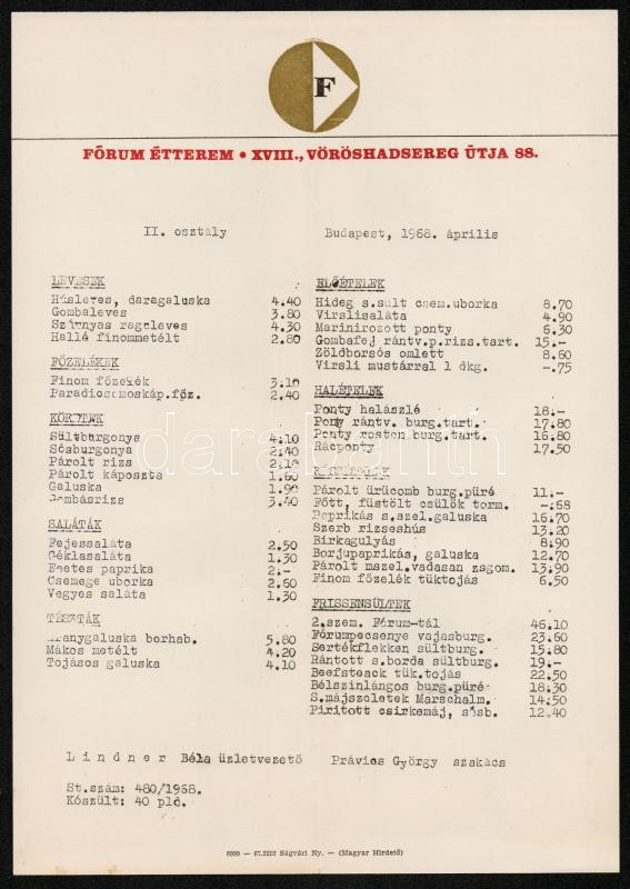 1968 Bp. XVIII., A Fórum Étterem étlapja https://www.darabanth.com/hu/289-Gyorsarveres/289.0/Festmeny-mutargy-papirregiseg-egyeb/Nyomtatvanyok~28/1968-Bp-XVIII-A-Forum-Etterem-etlapja~II1521245