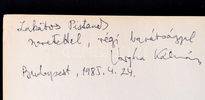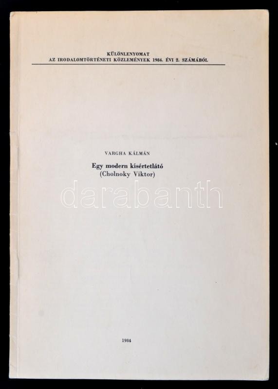 1984 Vargha Kálmán: Egy modern kísértetlátó. (Cholnoky Viktor.). Különlenyomat az Irodalomtörténeti Közlemények 1984. évi 2. számából. Bp., 1984, Akadémiai Kiadó, 163-172 p. Lakatos István (1927-2002) Kossuth-díjas írónak dedikált példány.