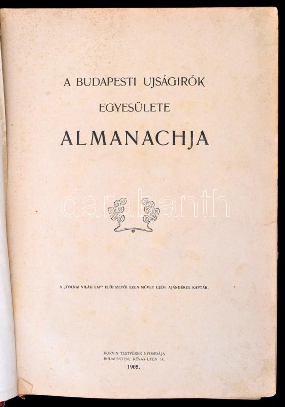 A Budapesti Ujságírók Egyesülete Almanachja. Bp., 1905, Korvin Testvérek - ny. Kiadói, festett díszesen aranyozott, dombornyomásos egészvászon kötésben, dízses szennylapokkal, szecesziós lapszéli dízsekkel, Vaszary János, Poll Hugó, Thorma János, Bihari Sándor, Szikszay Ferenc, Fényes Adolf, Tolnay Ákos és mások egészoldalas képeivel illusztrálva, széteső állapotban, a borítója megviselt, a gerince, kötése sérült, egy-két illusztráció hiányzik.