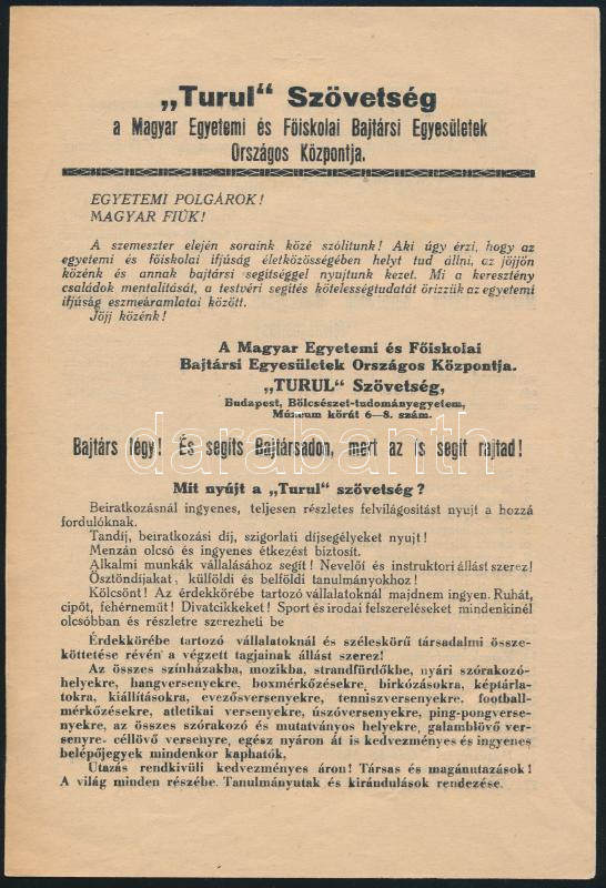 Leírás: cca 1930 Turul Szövetség, a Magyar Egyetemi és Főiskolai Bajtársi Egyesületek Országos Központjának felhívása, 4 p., 23x15,5 cm