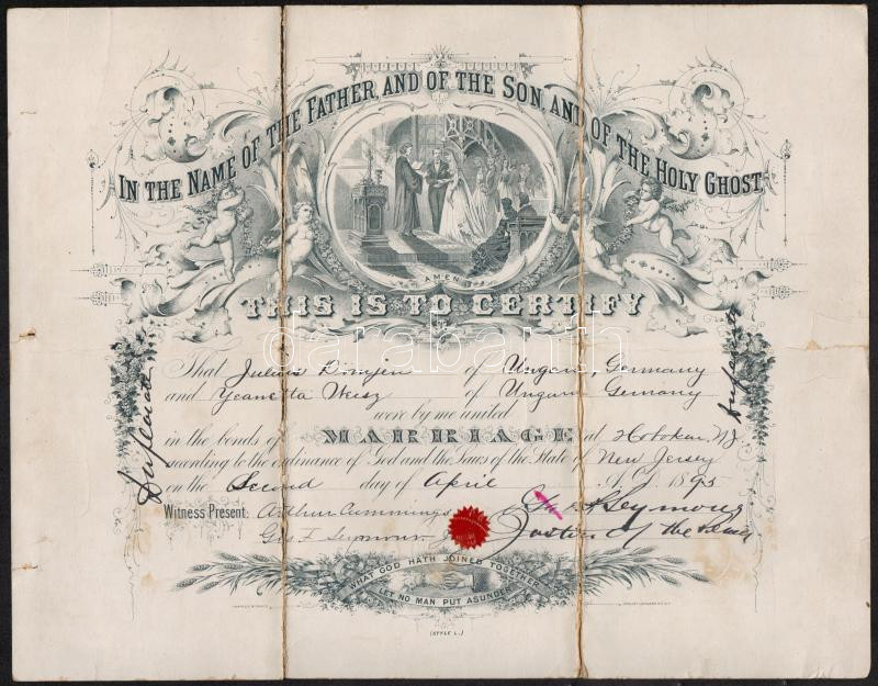1893 New Jersey. Magyar pár díszes házassági bizonyítványa. Szakadt 35... https://www.darabanth.com/hu/289-Gyorsarveres/289.0/Festmeny-mutargy-papirregiseg-egyeb/Okmanyok~17/1893-New-Jersey-Magyar-par-diszes-hazassagi-bizonyitvanya-Szakadt-35x28-cm~II1520152