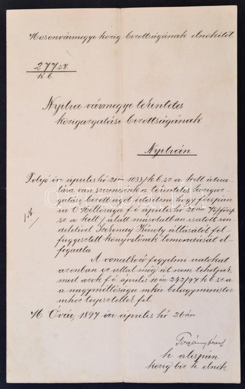 Leírás: 1897 Óvár, Nyitra vármegye közigazgatási bizottságának címzett levél felfüggesztett könyvelő lemondásával kapcsolatban