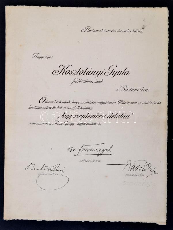 Leírás: 1910 Kosztolányi Gyula festőművész hivatalos értesítése a megnyert 'Ráth György-díjról', Forster Gyula, Benkő Kálmán, Kallós Ede aláírásaival.