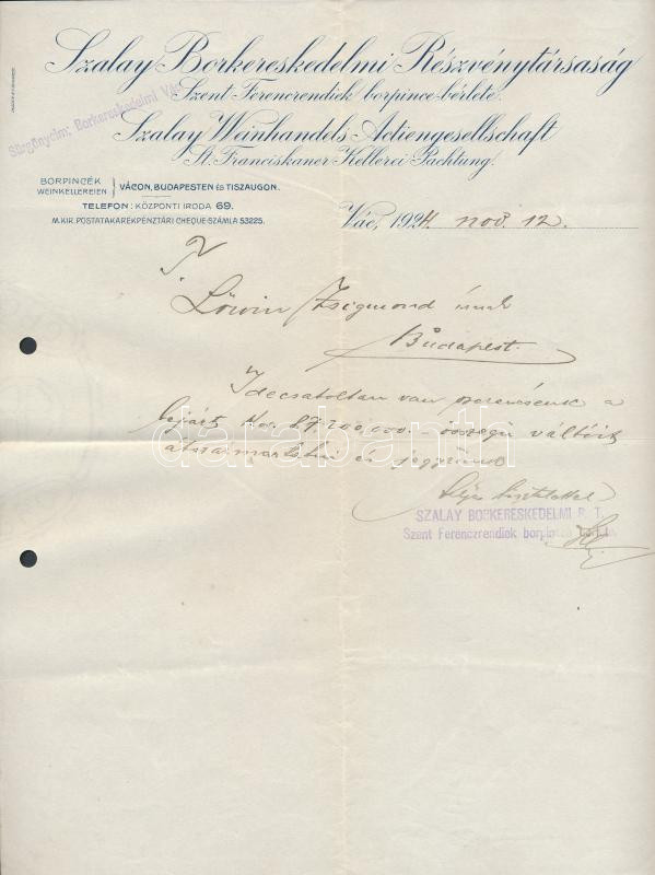 Leírás: 1924 Vác, Szalay Borkereskedelmi részvénytársaság Szent Ferencrendiek borpincebérlete fejléces levélpapírjára írt levél