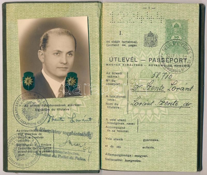 1937 Bp., A Magyar Királyság által kiállított fényképes útlevél / pass... https://www.darabanth.com/hu/289-Gyorsarveres/289.0/Festmeny-mutargy-papirregiseg-egyeb/Okmanyok~17/1937-Bp-A-Magyar-Kiralysag-altal-kiallitott-fenykepes-utlevel-passport~II1526004