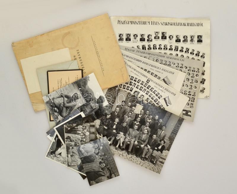 1951-1975 Vörös Miklósné pénüzgyminisztériumi osztályvezetÅ‘ fotói (9 db.), minisztériumi távbeszélÅ‘ névsora, meghÃvója és névjegykártyája a KÅ‘bányai TextilmüvektÅ‘l, és temetési meghÃvója Antos István (1908-1960) pénzügyminiszter temetésére, valamint bankszakiskolai tablófotói (5 db).