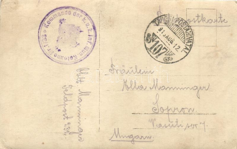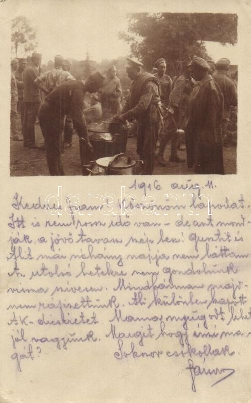 1916 Osztrák-magyar katonák ételosztás közben a táborban / K.u.K. military field camp, dining soldiers, photo + Kommando der K.u.K. Inf. Mun. Kolonne Nr. 1/33. (EK)